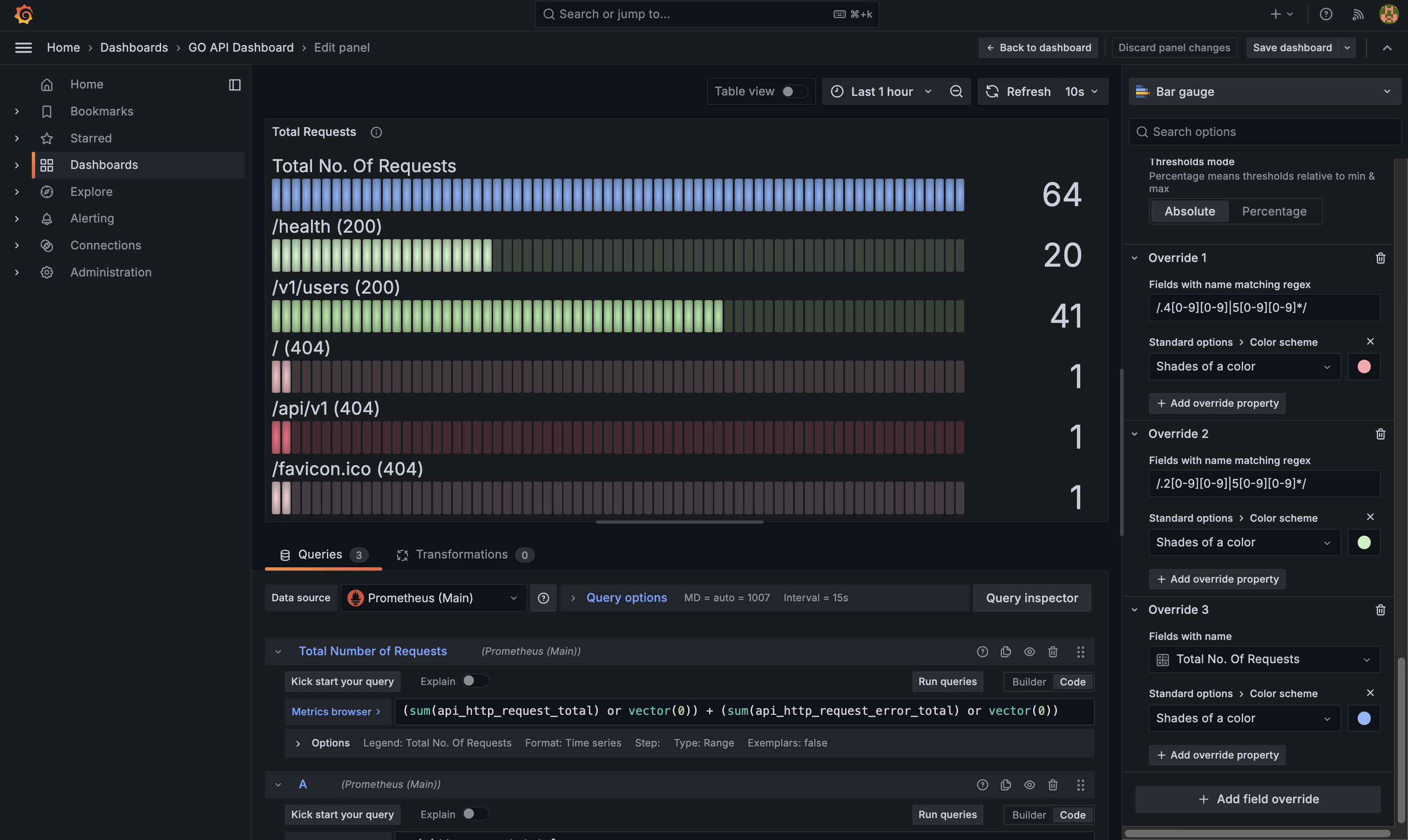 You can use different panels to visualize the metrics. This guide doesn't go into details of Grafana. You can refer to the Grafana documentation for more information. There is a Bar Gauge panel to visualize the total number of requests from different endpoints. You used the api_http_request_total and api_http_request_error_total metrics to get the data.